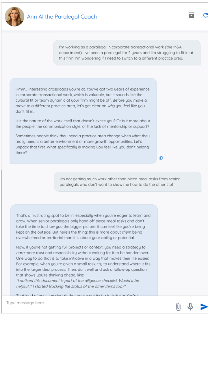 You don’t need extra time. Ann AI saves you time. Whether you’re stuck on a drafting task, need a quick checklist, want a strategy for a difficult attorney conversation, or need help building your career plan, you can get answers in seconds. Most members pop in for micro-coaching moments throughout the week, and those tiny shifts add up to big wins.